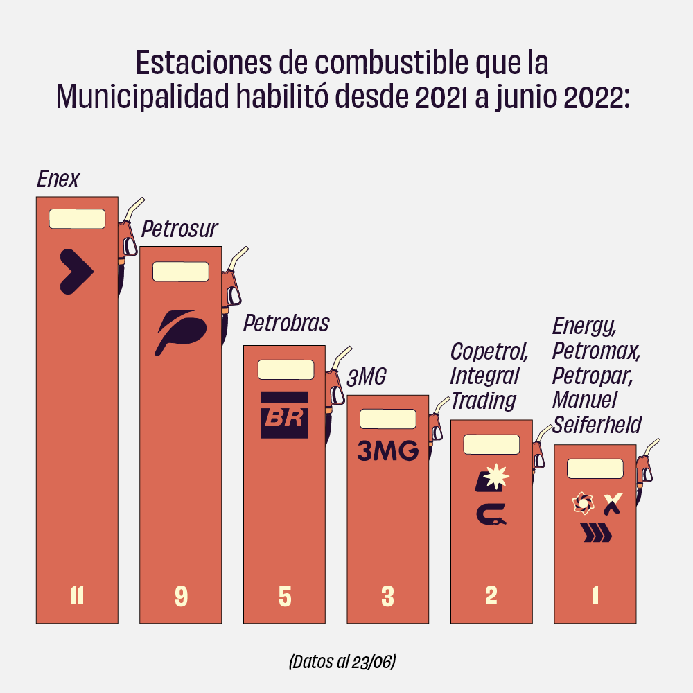 El ranking lo encabeza Enex del Grupo Cartes, con 11 estaciones de combustible; nueve son de Petrosur, del Grupo Abderrada Yambay, con inversiones también en el sector agroganadero. Cinco son de Petrobras, gestionados por la empresa El Shah SA; tres son de 3MG; dos son de Integral Trading de la familia Bogarín Canale (también ligados a Concret-Mix);dos son de Copetrol del Grupo Zapag (pese a que originalmente se había opuesto a la eliminación de distancias). Tienen una el emblema público Petropar, Petromax (de la familia Hoeckle, cercanos al presidente Mario Abdo) y una 3MG pero bajo el emblema Energy, del Grupo Crisma. Otra, a nombre de Manuel Seiferheld – quien vendió sus acciones en Gasur/Enex a Cartes – no tiene un emblema identificable por ahora.