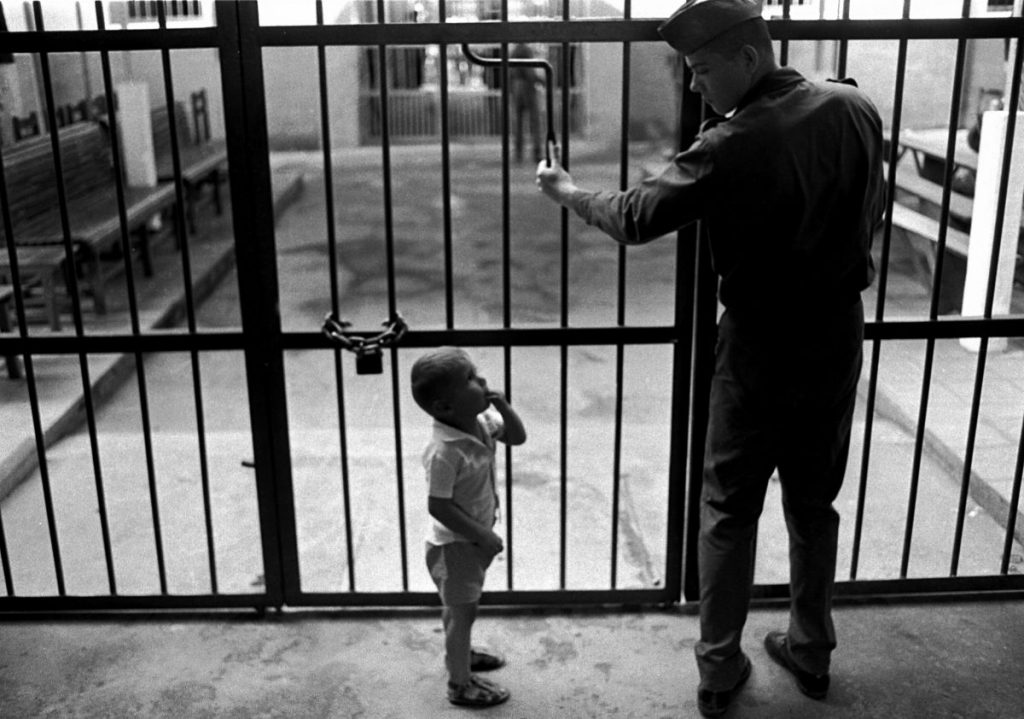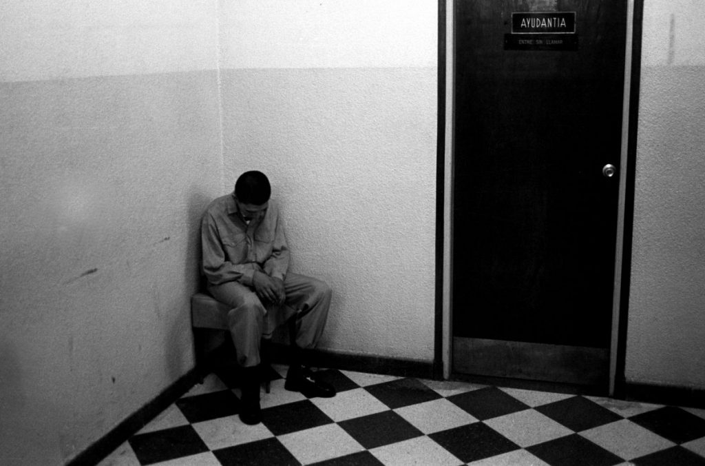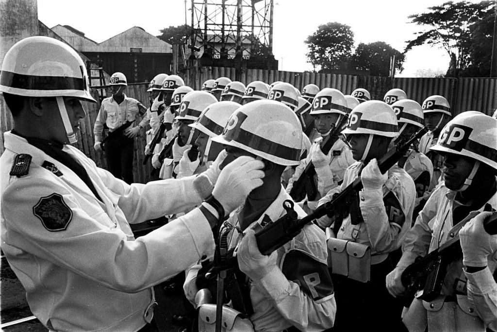 Soldado de la Policía Nacional custodiando el portón de la Penitenciaría Nacional de Tacumbú, Asunción 1991.