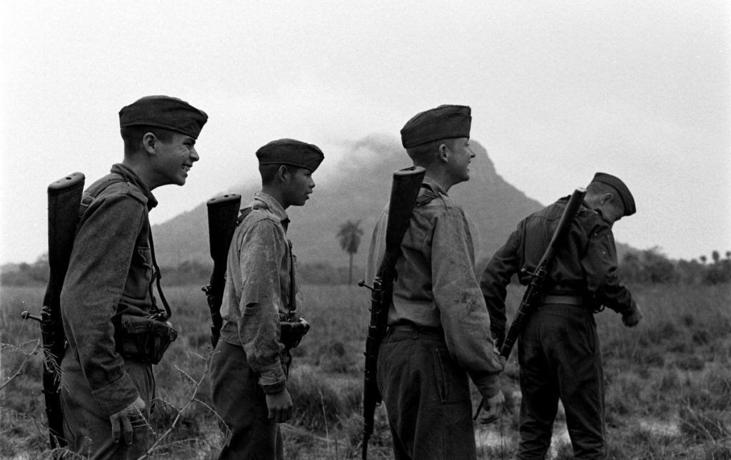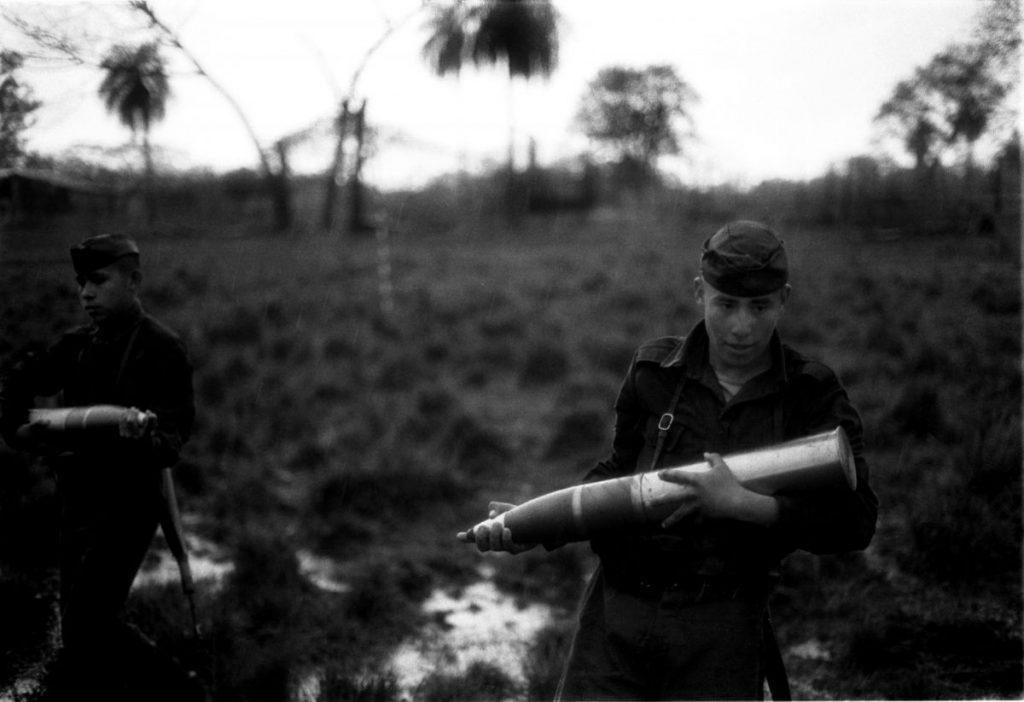 Artilleros trasladan balas de cañón de 105mm bajo la lluvia en Paraguarí, 1990.