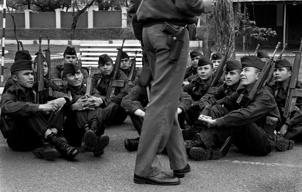 Soldados del Regimiento Guardia Presidencial reciben instrucción en el patio del cuartel, Asunción 1990.