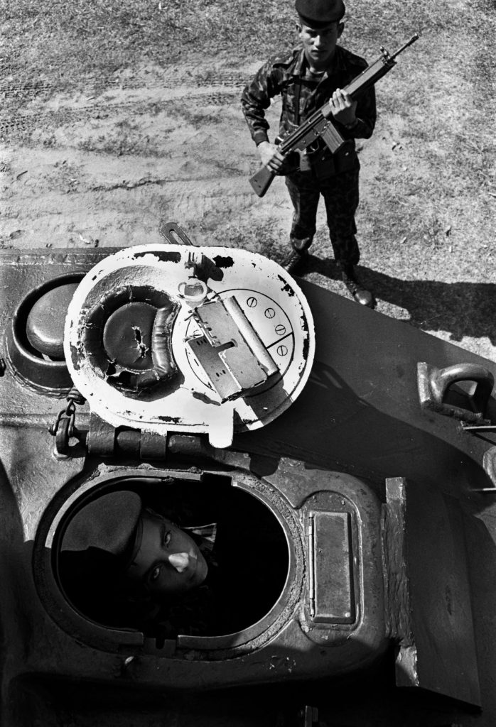 Jinete del III Cuerpo de Ejército (Caballería) realiza maniobras en un tanque Sherman de la II Guerra Mundial, Asunción 1990.