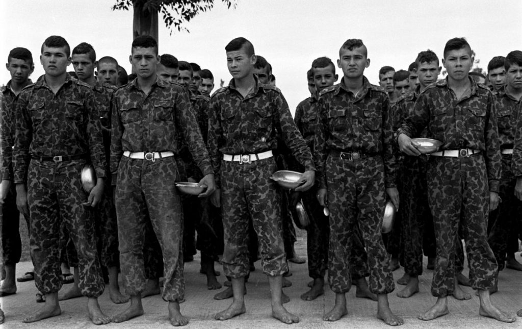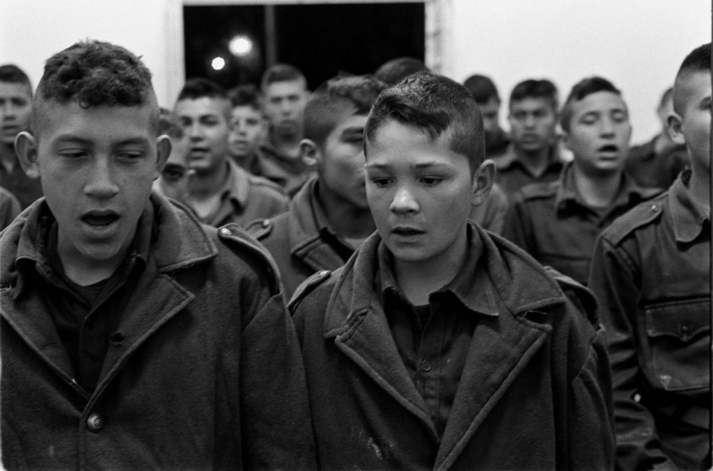Conscriptos rezando en la escuela del Regimiento Guardia Presidencial, Asunción 1990.