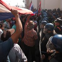 «Después de Marina Kue, Guahory fue el asentamiento que fue atropellado con todo el aparato represivo del Estado. Movilizaron miles de policías de los grupos especiales, helicópteros… y los propios sojeros brasileros dirigían el desalojo, que fue muy violento», dice Marcial Gómez, dirigente de la Federación Nacional Campesina, una de las principales organizaciones campesinas de Paraguay.