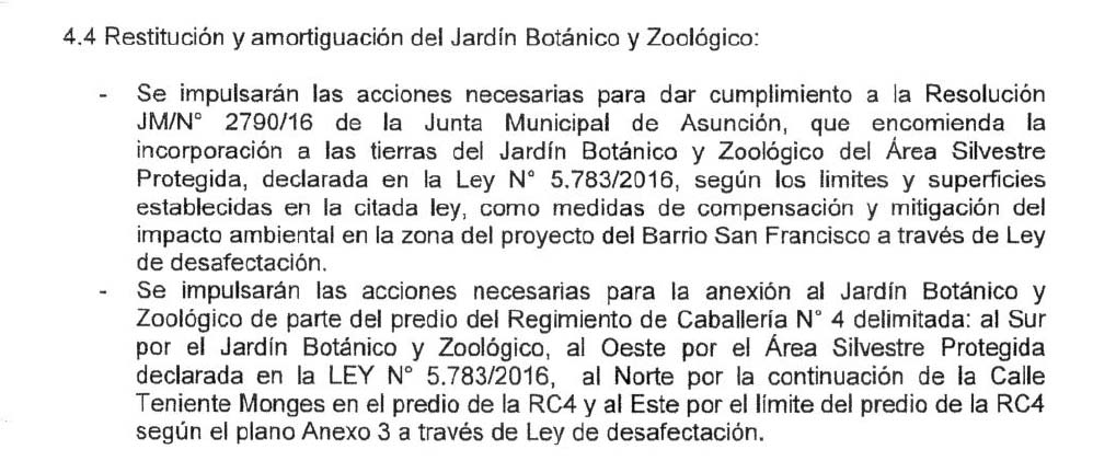 La reserva del Ministerio de Defensa ya había sido pedida por la Junta Municipal de Asunción en 2016 como compensación por la construcción de mil viviendas en el Barrio San Francisco. «La aprobación del Barrio San Francisco contemplaba por esta resolución la incorporación de las 32 hectáreas como mitigación por el impacto» dice el concejal Federico Franco Troche, por lo que con lo aprobado entre el MOPC y la Municipalidad en el convenio de obras del Botánico, la ciudad se quedó sin compensación por el impacto del Barrio San Francisco en el ecosistema. El Estado ofrece la misma reserva ya existente de compensación para dos obras distintas.