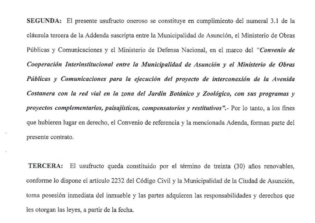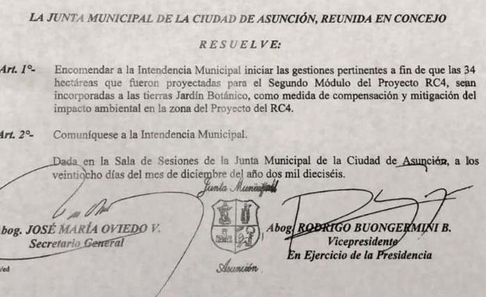 El convenio original firmado por el Ministerio de Obras Públicas y la Municipalidad de Asunción en 2017 compensaba al Botánico por las obras con dos terrenos. El primero era de 54 hectáreas y correspondía al Regimiento 4 de Caballería. El segundo eran las 32 hectáreas de una reserva de área silvestre de carácter privado del Ministerio de Defensa. Pero una adenda firmada en noviembre de 2018, con votos de concejales de ANR, PQ, Hagamos y PEN, eliminó el primer terreno de las compensaciones.