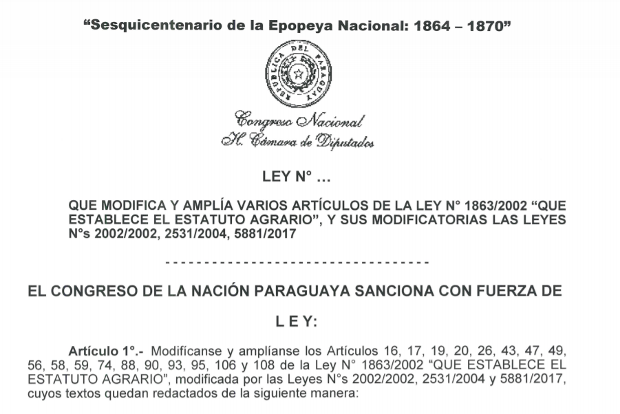 El 16 de diciembre de 2020, mientras nadie prestaba atención, la Cámara de Diputados aprobó un proyecto que modifica y amplía varios artículos del Estatuto Agrario, la principal ley que rige la regulación de tierras públicas en Paraguay. El proyecto fue presentado por los diputados Avelino Dávalos (Caazapá – ANR), Pastor Soría (San Pedro – ANR) y Hugo César Capurro (Misiones – PLRA llanista) como miembros de las comisiones de Bienestar Rural y la de Ecología, Recursos Naturales y Medio Ambiente. El proyecto fue calificado como «lo más acertado» en una audiencia pública por el presidente de la Comisión de Defensa de la Propiedad Privada de la Asociación Rural del Paraguay (ARP), Diego Torales, que a su vez participó como representante de la ARP en el consejo del INDERT, donde felicitó a los proyectistas. Su única objeción: que el Indert esté habilitado de oficio a pedir mensuras judiciales en sitios donde haya sospechas de que se ocupan tierras fiscales. «Ya tenemos demasiados casos pendientes para abrir nuevos expedientes», argumentó.