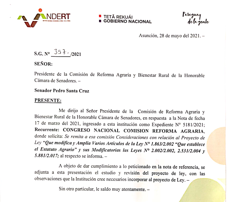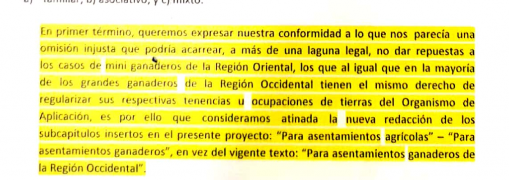 El INDERT, que había estado ausente de las discusiones en la Comisión de Bienestar Rural del Senado sobre el nuevo Estatuto Agrario, envió el 28 de mayo una nota a senadores abogando por la modificación, no el rechazo del proyecto, según el documento al que accedió El Surtidor. El ente sugiere eliminar el citado artículo 88, pero solo retocar el 20, que habilita a ganaderos a recibir tierras públicas en la Región Oriental. Según el INDERT (ver captura del documento), es necesario “dar respuestas a los casos de mini ganaderos de la Región Oriental”. La propuesta del INDERT es permitirles a ellos regularizar sus tierras pero prohibir la creación de nuevos asentamientos ganaderos en tierras públicas de la Región Oriental.