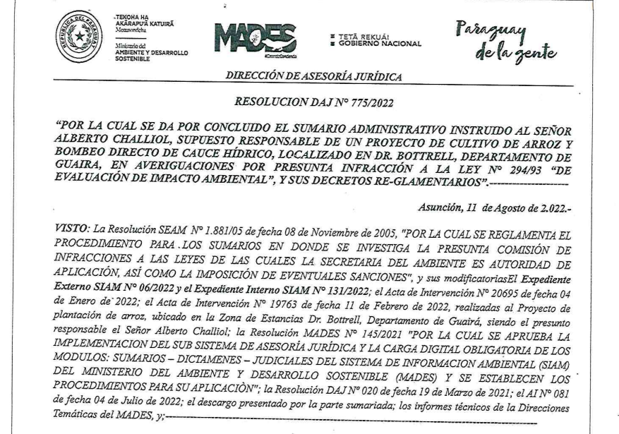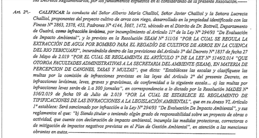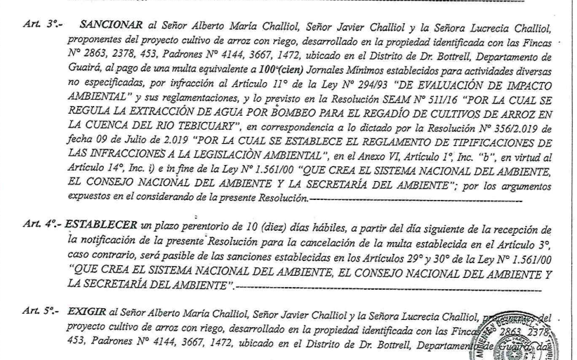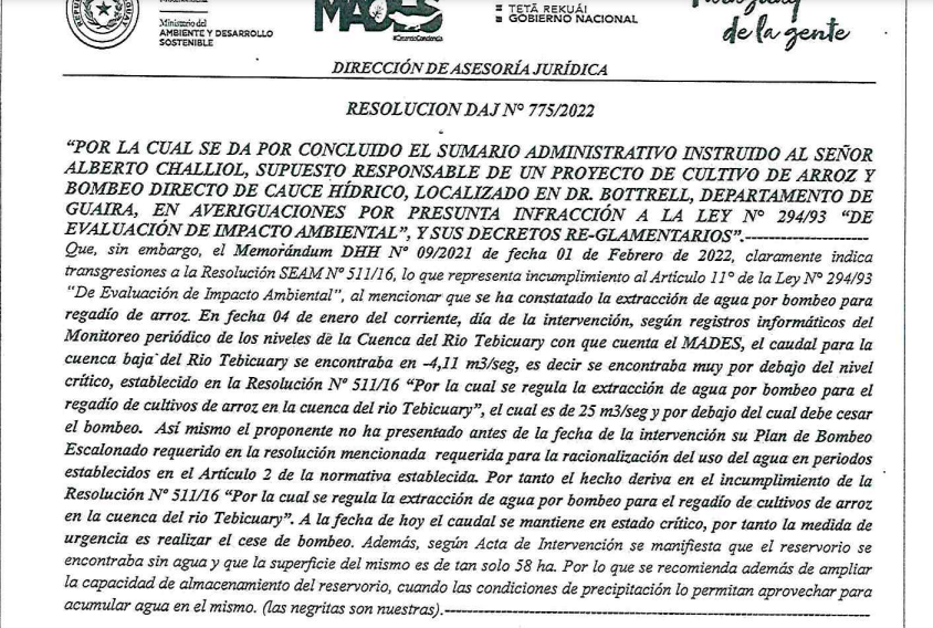 El resultado del sumario, firmado por la abogada María Bobadilla, directora de Asesoría Jurídica del ministerio, calificó la infracción de Challiol como “levísima” pese a que considera que el arrocero no solo incumplió con su licencia ambiental sino también con la resolución que regula el uso del agua del Tebicuary, cuyo estrés hídrico está siendo empeorado por el cambio climático y “generando conflictos entre usuarios”, de acuerdo con un informe oficial del Estado paraguayo.