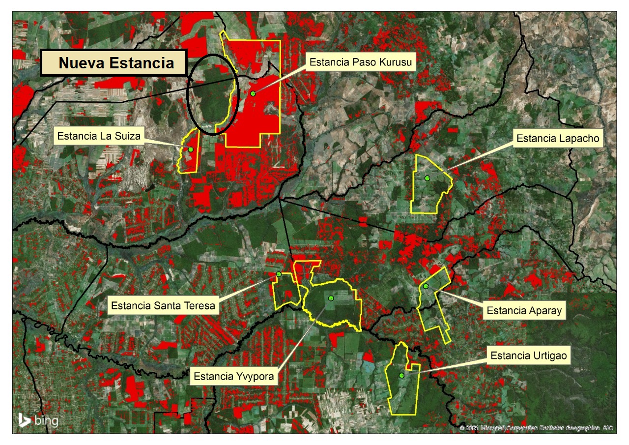 A estas siete propiedades sumó una última adquisición en 2022: la estancia Ciervo Verde, de unas 7000 hectáreas, ubicada casi al lado de la estancia Paso Kurusu, en Santa Rosa del Aguaray. Ciervo Verde alberga, quizá, el último remanente de bosque de la zona del BAAPA.