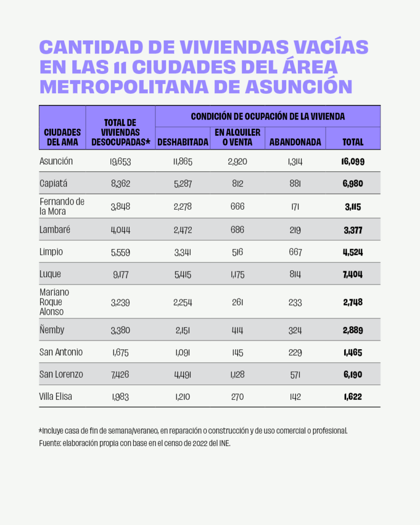 Según el censo de 2022, Asunción es la ciudad con más viviendas desocupadas, seguida de Ciudad del Este en Alto Paraná. Las edificaciones en esta situación en todo el país son 335.809, lo que representa el 16% del total de las viviendas a nivel nacional. Esta categoría incluye casas de fin de semana, las que están en reparación o construcción y las de uso comercial o profesional. Si excluimos estos tipos, vemos que la capital tiene 16.099 viviendas en las que no vive nadie: 11.865 están deshabitadas, 2.920 en alquiler o venta y 1.314 abandonadas, como las del centro histórico. Esto equivale a casi todas las casas ocupadas que hay en las ciudades de Concepción, Caacupé o Villarrica. La misma tendencia, aunque en menor medida, se observa en Luque, San Lorenzo y Capiatá.