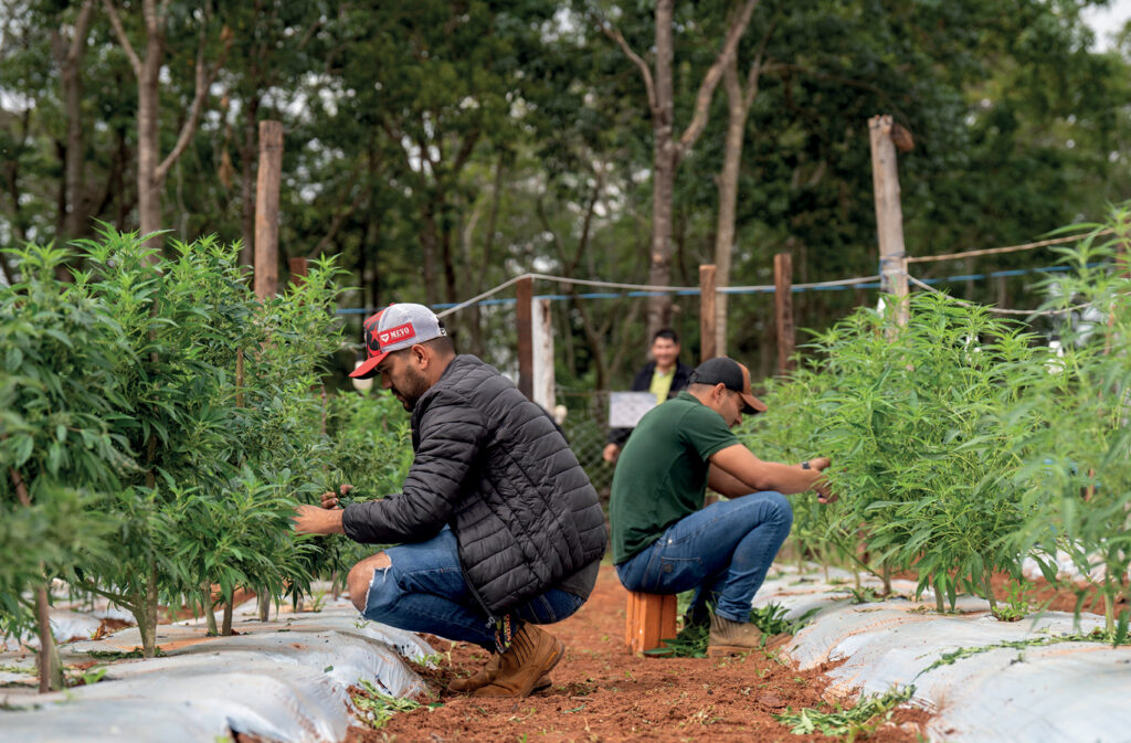 Sus plantas están muy bien cuidadas, lucen saludables, ni una marca de plagas en las hojas verdes intensas, en unas se manas comenzarán su floración. En unos meses serán aceite, después de que las sequen y procesen un puñado de mujeres de la colonia. Son clones de cáñamo —el cannabis sin efecto psicoactivo—, reproducidos de una genética importada de Suiza muy adaptada al microclima de la colonia 10 de Agosto y también a los manejos con microorganismos para mejorar el suelo, a preventivos naturales contra plagas y a la poda baja que hacen con guantes para no contaminar el cultivo. Estas técnicas permiten mejorar la productividad y la calidad fitosanitaria de la flor que se necesita para el aceite. Y se apartan diametralmente de las técnicas agronómicas practicadas por el campesino medio.
