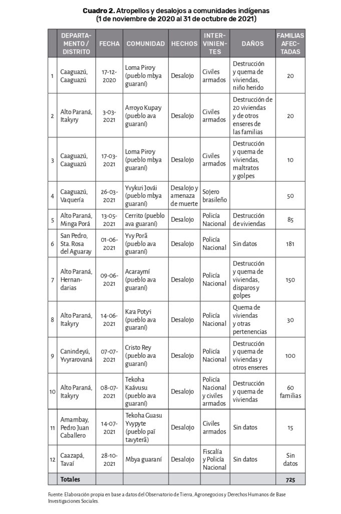 En abril de 2020, la Relatora Especial sobre el derecho a una vivienda digna, Leilani Farha, publicó una nota de orientación para los Estados en la que instó a los gobiernos a “declarar el fin de todos los desalojos forzosos de asentamientos y campamentos informales” durante la pandemia de la Covid-19. Contrario a esto, 725 familias fueron afectadas por los 12 desalojos a comunidades indígenas ejecutados entre noviembre de 2020 y octubre de 2021 según los datos de Base-IS.