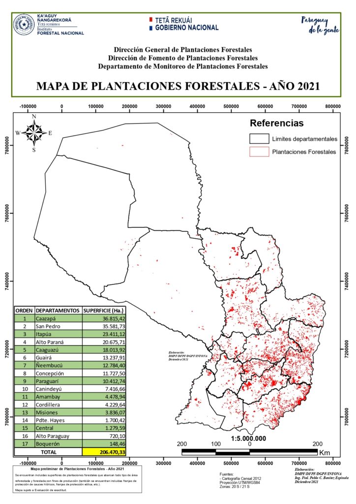 La cantidad de superficie de plantaciones forestales y reforestación con fines de producción es de 206.470 hectáreas en todo el país desde el 2013 hasta el 2021, según datos del Instituto Forestal Nacional (Infona). En entrevista para La Precisa, el ingeniero Pablo Benítez, del Departamento de Monitoreo de Plantaciones Forestales del Infona, explicó que este dato es actualizado anualmente, a excepción del 2014 y el 2016, años en que no se actualizó el mapa.
