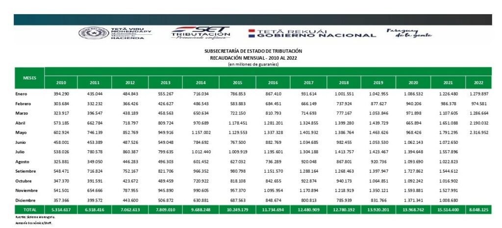 El Sistema Marangatu arroja que la recaudación aumentó en el periodo de gobierno de Mario Abdo. En 2018, el organismo estatal recaudó Gs. 12.780.192 millones y cerró el 2021 con Gs. 15.514.400 millones.
