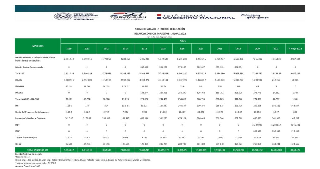 Entre diciembre de 2018 y abril de 2022, la SET registró un aumentó el número de contribuyentes activos de 574.526 a 679.636. Esto incluye a personas físicas y jurídicas. A pesar de este aumento, 630.874 personas físicas no se encuentran aportando por haber pedido una suspensión temporal del RUC. Este número es casi el mismo número total de contribuyentes activos. En 2018, eran apenas 201.686 las personas en esta situación.