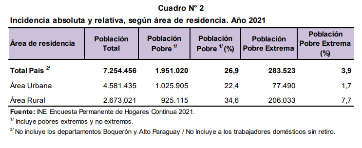 El último informe publicado sobre la pobreza en Paraguay indica que ésta aumentó 2,7% del 2018 al 2021. El 2021 cerró con 1.951.020 personas se encontraban en situación de pobreza, según datos del INE. En cambio, la pobreza extrema disminuyó de 4,8% a 3,9% durante el mismo período.