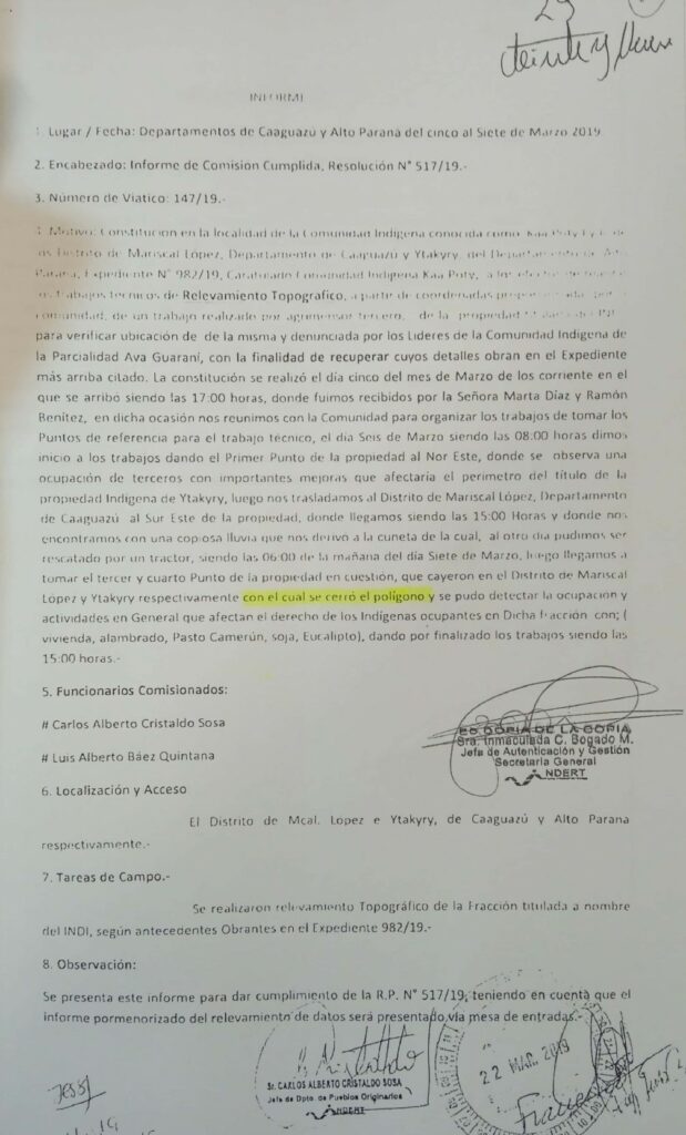 El abogado Jorge Álvarez, representante de la comunidad, explicó en la sesión que en 2019 el INDERT realizó un relevamiento de datos topográficos sobre la Finca 1.628. Los funcionarios del INDERT Carlos Alberto Cristaldo y Luis Alberto Báez presentaron un informe que menciona que las coordenadas de la Finca N° 1.628 «cayeron en el Distrito de Mariscal López e Itakyry respectivamente con el cual se cerró el polígono y se pudo detectar la ocupación y actividades en general que afectan el derecho de los indígenas».