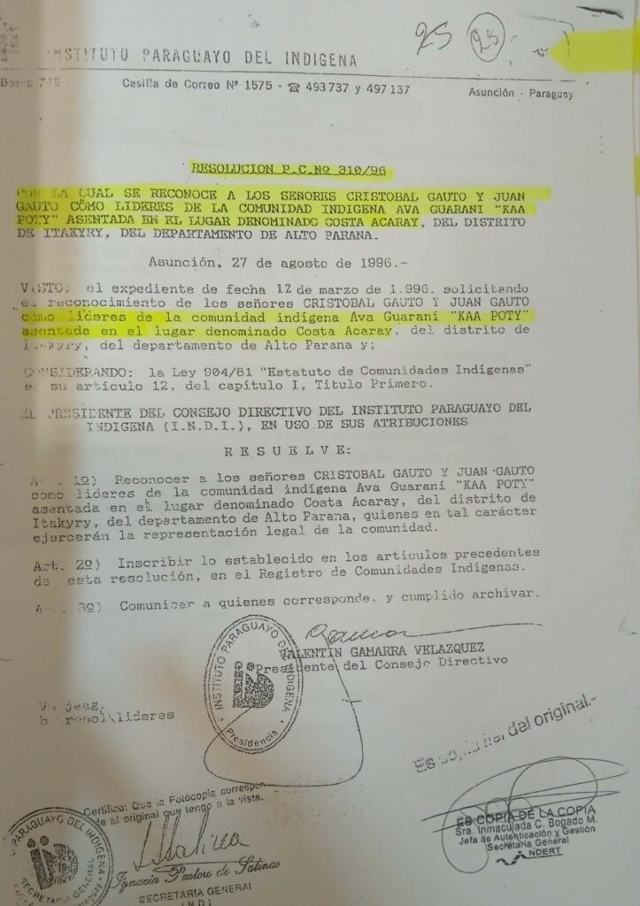 Cristóbal Gauto, reconocido como líder de la comunidad Ka’a Poty según la resolución P.C. N° 310 de agosto de 1996 del INDI, narró en la sesión del Senado que «nosotros ya vivíamos ahí, nuestros padres, nuestras madres. Ese es nuestro territorio, de los indígenas (…) yo recuerdo, ya era un jovencito cuando en 1986, durante el Mundial de México, nosotros nos íbamos por el monte hasta Itakyry para ver los partidos en la televisión».