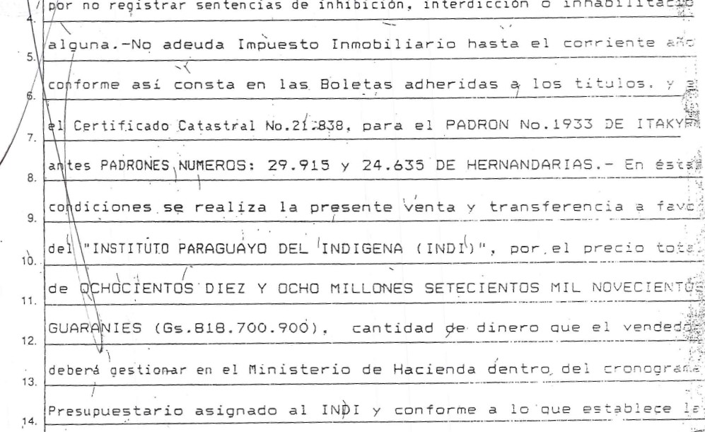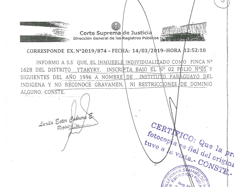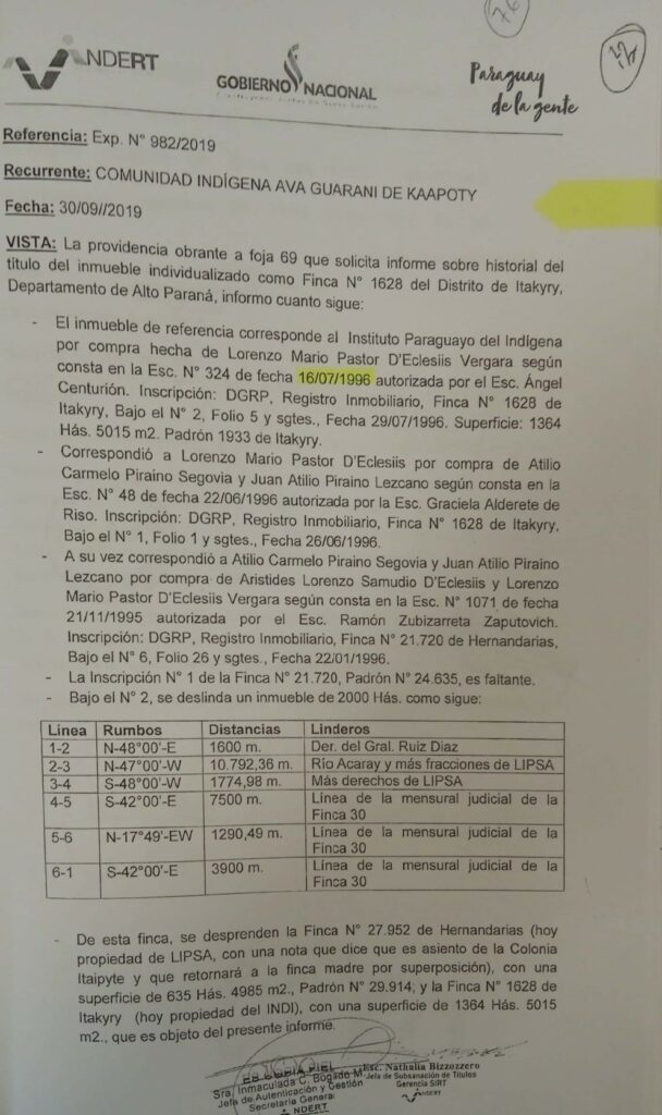 En julio de 1996, el INDI adquirió de Lorenzo Mario Pastor D’Eclesiis la Finca N°1.628 con Padrón N° 1933 de Itakyry de 1.364 hectáreas, anteriormente registrada con los números 29.915 y 24.635 de Hernandarias, según el título del INDI. Ese mismo mes, el terreno fue registrado en Catastro a nombre del INDI. Esto lo confirmó Gloria Paredes, directora del SNC, en una sesión de la mesa directiva del Senado el pasado 4 de julio. Un reporte de 2019 de la Dirección de Registros Públicos confirma que la titularidad de las tierras son del INDI.