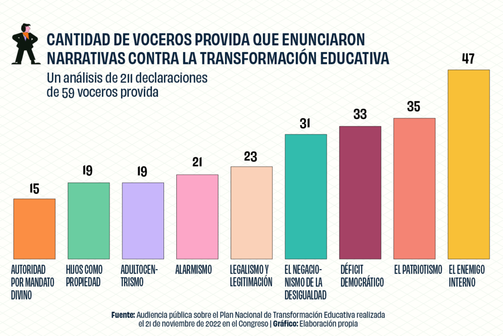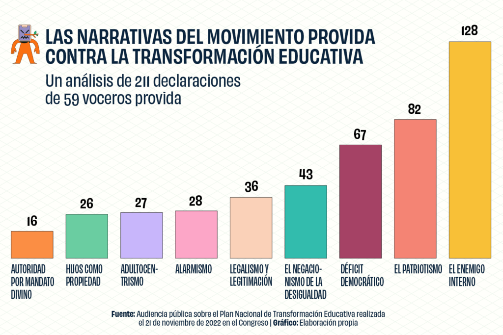 Analizamos 211 declaraciones de los oradores en la audiencia pública sobre el Plan e identificamos nueve narrativas predominantes: el enemigo interno, patriotismo, déficit democrático, negacionismo de la desigualdad social, los hijos como propiedad, el alarmismo, el legalismo, el adultocentrismo y la autoridad por mandato divino.