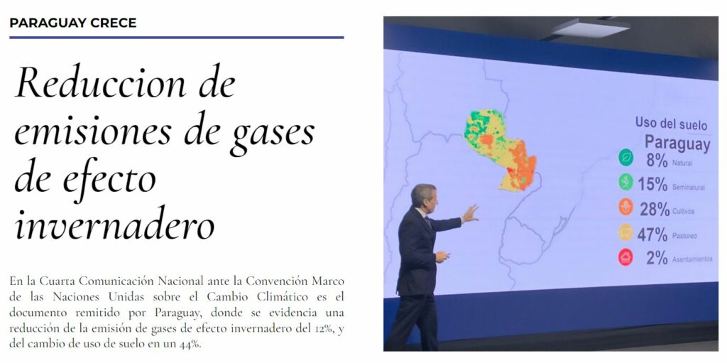 En su informe de gestión de 100 días presentado el 15 de noviembre, el gobierno de Santiago Peña menciona como un logro «la reducción de emisiones de gases de efecto invernadero y cambio de uso de suelo». Según el documento, en la Cuarta Comunicación Nacional de Paraguay ante la Convención Marco de las Naciones Unidas sobre Cambio Climático, «se evidencia una reducción de emisiones de gases de efecto invernadero del 12% y del cambio del uso del suelo del 44%».
