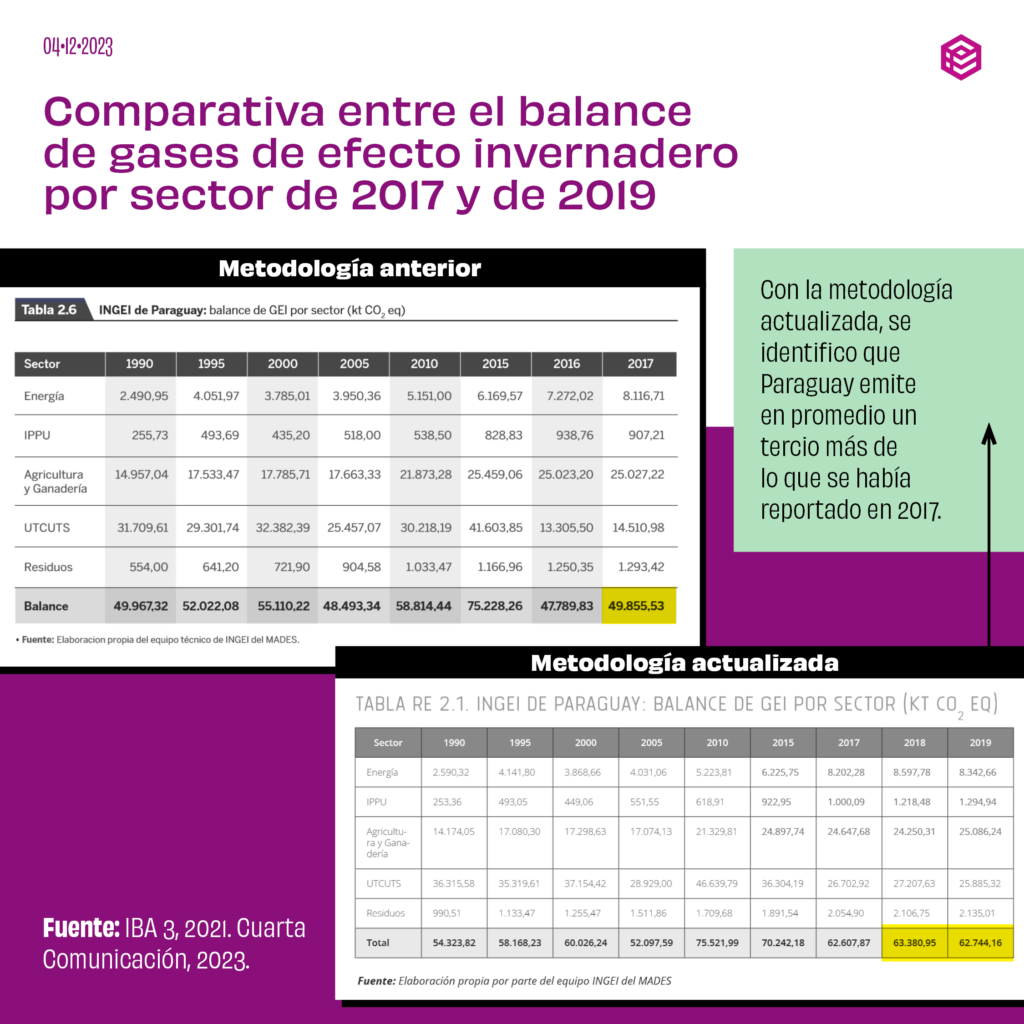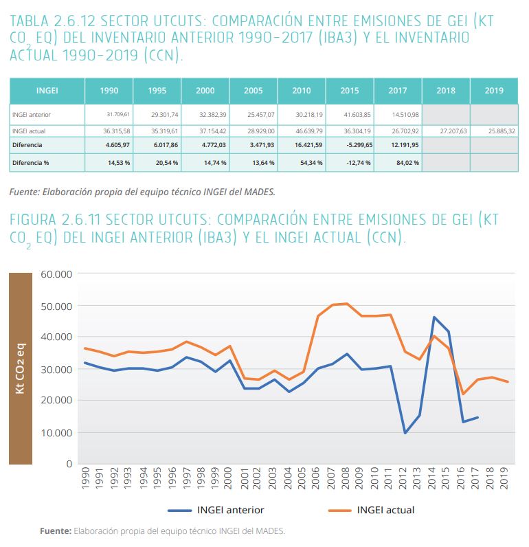 Esta diferencia en comparación con reportes anteriores se debe a una actualización de la metodología científica, que incluyó una mejor recolección de datos basados en informes de cobertura forestal del Infona y prácticas internacionales avaladas por el Panel Intergubernamental de Expertos de Cambio Climático. Por ejemplo, documentó que en comparación a los datos reportados anteriormente, las emisiones de Paraguay por deforestación eran un 84% más solo en 2017 (ver cuadros).