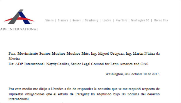 Firmado por la abogada de ADF para América Latina, Neydy Casillas, el memo indica que fue escrito en respuesta a pedidos de apoyo de los activistas paraguayos.