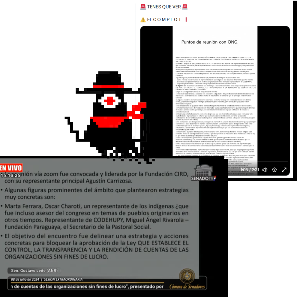 El video pone en primera plana un montaje que incluye a la excandidata a la vicepresidencia Soledad Núñez, Martín Burt, director de la Fundación Paraguaya y Marta Ferrara, directora de Semillas para la Democracia. Todo enmarcado en una narrativa de que los «oenegeros» no quieren transparentar de dónde obtienen fondos y cómo los gastan, algo que esta ley supuestamente va a transparentar. Sin embargo, las organizaciones que operan legalmente sin recibir fondos públicos ya rinden esta información a varias instituciones estatales, entre ellas la Dirección Nacional de Ingresos Tributarios (DNIT) y Seprelad.