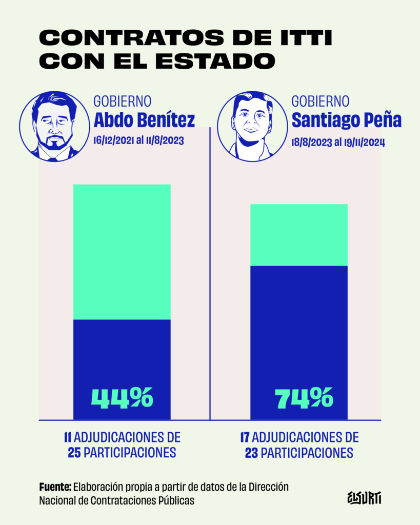 Desde la asunción de Peña, ITTI accedió a 17 licitaciones públicas de las 23 a las que se postuló, superando así las 11 adjudicaciones que recibió —de sus 25 postulaciones— durante el gobierno de Mario Abdo Benítez. Entre ellas, tres con el Banco Nacional de Fomento por un total de 9 mil millones de guaraníes entre diciembre de 2023 y julio de 2024. En todos los casos, ofreció más barato su servicio contra los mismos competidores, Roshka S.A. y Konecta S.A.; si bien estas empresas, al igual que ITTI, presentaron ofertas muy por debajo del precio referencial del banco en sus llamados.