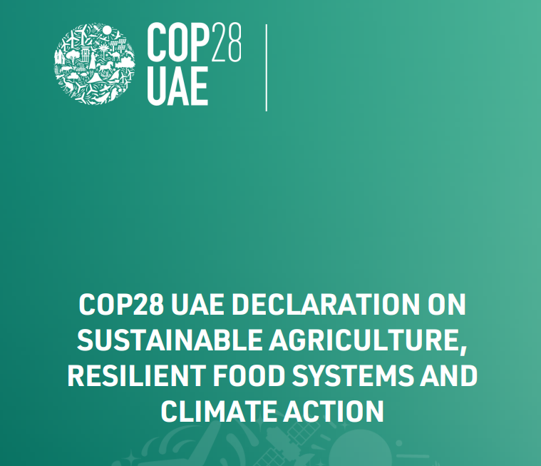 Bajo el nombre de “Declaración sobre Agricultura Sostenible, sistemas alimentarios resilientes y acción climática”, Emiratos Árabes Unidos busca un compromiso no vinculante para orientar políticas y apoyo público a la agricultura que promueva una mejor producción al tiempo de reducir las emisiones del sector, el impacto en el agua y los ecosistemas. No es vinculante porque está por fuera de las negociaciones oficiales en la COP28, y no incluye ningún tipo de compromiso jurídico, a diferencia del Acuerdo de París.