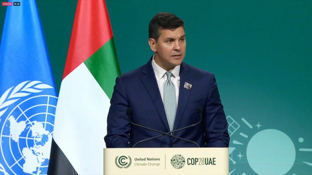 El presidente Santiago Peña en su discurso en la reunión de alto nivel en la COP28 de Dubái. Fuente: Presidencia de Paraguay