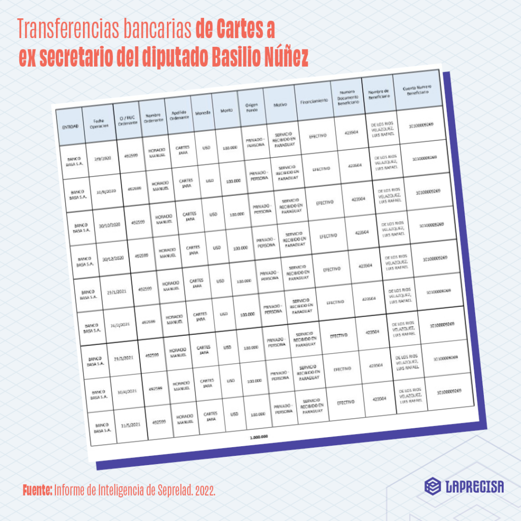 En mayo del mismo año, un informe de inteligencia de la Seprelad reveló que Luis Rafael De Los Ríos Velázquez, ex secretario Basilio “Bachi” Núñez durante su intendencia en Villa Hayes entre 2010 y 2015 y hoy diputado cartista y candidato a Senado, recibió transferencias mensuales desde la cuenta personal de Horacio Cartes por valor de 100.000 dólares americanos entre septiembre de 2020 y mayo de 2021.