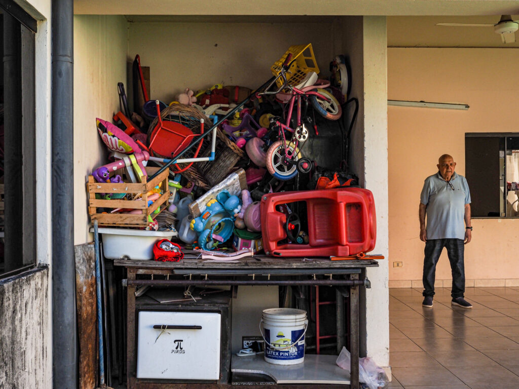Oscar Ávila se para en el pasillo junto a un montón de juguetes para niños en el albergue Rosa María para madres preadolescentes. Foto: Nathaniel Janowitz, para VICE World News.