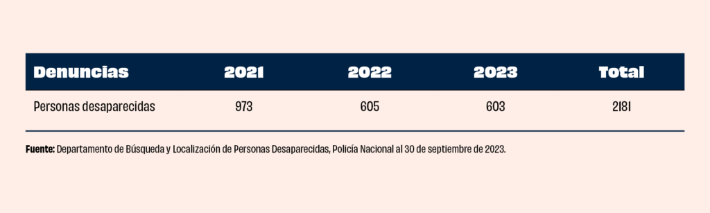 Existe un problema con el registro de datos que lleva la Policía Nacional. Hay datos que se contradicen. Por ejemplo, en una respuesta a un pedido de información pública de abril de 2023, según el Departamento de Búsqueda y Localización de Personas Desaparecidas, en 2022 hubo 2.479 denuncias de personas desaparecidas. Sin embargo, en respuesta a un segundo pedido de información pública de agosto de 2023, según el Departamento de Estadística, en el 2022 hubo 1.377 denuncias.