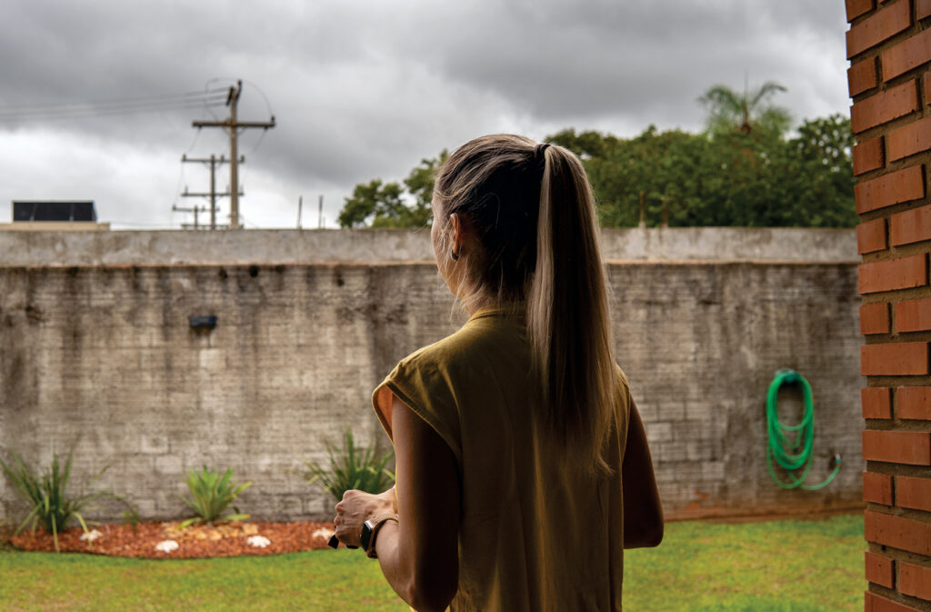 Vivir al lado de una criptominera. Denise Báez observa la muralla que separa su casa de una de las granjas de Bitfarms en Villarrica. Foto: Elisa Marecos & Sandino Flecha.