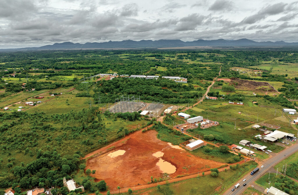 Vista aérea de la subestación de Paso Pe de la Administración Nacional de Electricidad y de la criptogranja de Bitfarms en Villarrica. Foto: Elisa Marecos & Sandino Flecha.