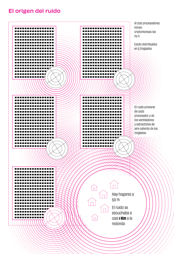 El ruido que atormentó al barrio Santa Lucía entre junio y noviembre de 2024 proviene de los procesadores, ventiladores y extractores de aire caliente que regulan la temperatura. Los pobladores convivieron con eso hasta que lograron que la Fiscalía impute por emisión de ruidos dañinos al responsable de Bitfarms. Pero antes recurrieron sin éxito a sus autoridades locales y el Ministerio de Ambiente y Desarrollo Sostenible (Mades).