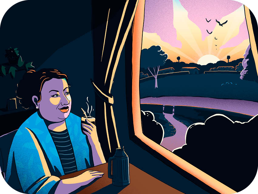 Yren se levanta temprano, arranca a las cinco de la mañana y disfruta del canto de los pájaros con los primeros rayos del sol. El agua se calienta en la pava, mientras prepara su termo para el mate, en un ritual cotidiano de disfrute.